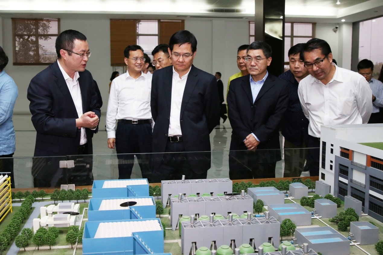 徐少華一行參觀“零排放”金屬表面處理中心污水處理模型,聽取項(xiàng)目相關(guān)介紹