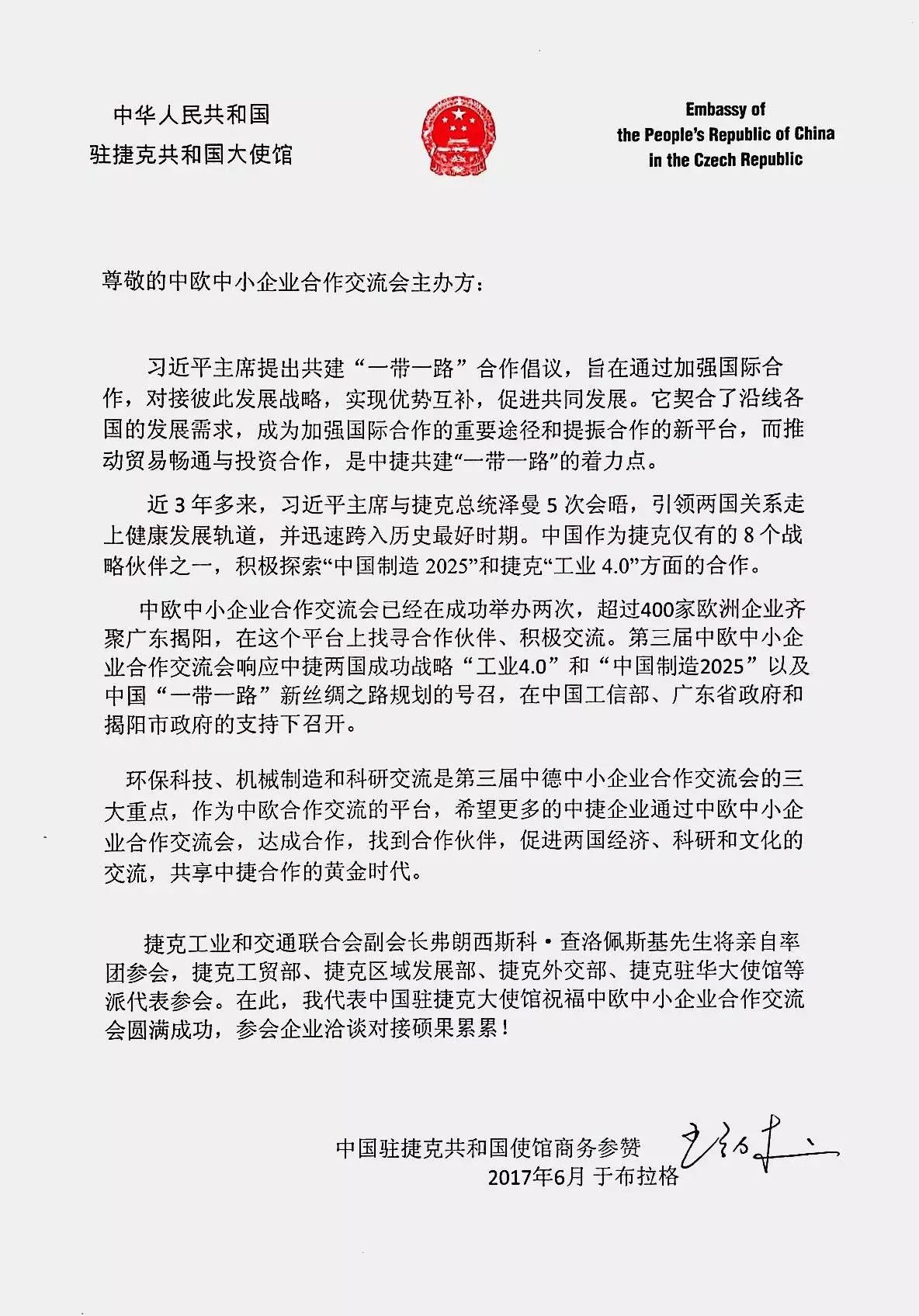 中國駐捷克共和國大使館發(fā)來賀電,祝福交流會(huì)圓滿成功,參會(huì)企業(yè)洽談對(duì)接碩果累累!
