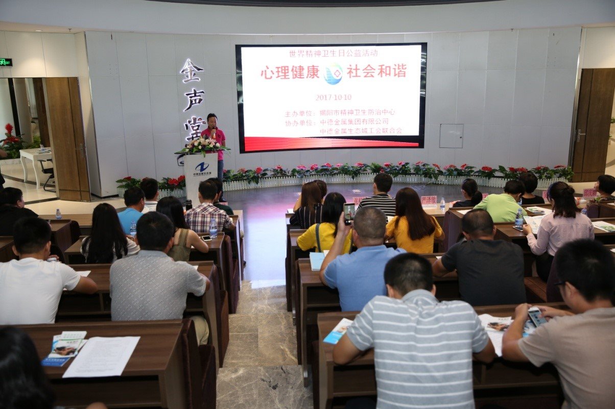 為引起社會(huì)對(duì)精神衛(wèi)生問(wèn)題的關(guān)注,讓職工對(duì)慢性病防治知識(shí)有所了解,提高職工的健康水平,10月10日上午,由揭陽(yáng)市慢性病防治院主辦,中德金屬集團(tuán)有限公司及中德金屬生態(tài)城工會(huì)聯(lián)合會(huì)協(xié)辦的“心理健康•社會(huì)和諧”健康講座在中德金屬生態(tài)城四大中心金聲堂舉行。市慢性病防治院院長(zhǎng)張梓揚(yáng)等參加活動(dòng)。來(lái)自中德金屬集團(tuán)辦公室、房產(chǎn)營(yíng)銷部、項(xiàng)目管理部、信息技術(shù)部及表處園、建筑公司、物業(yè)公司、研究院等集團(tuán)子公司80多人到場(chǎng)聆聽(tīng)。