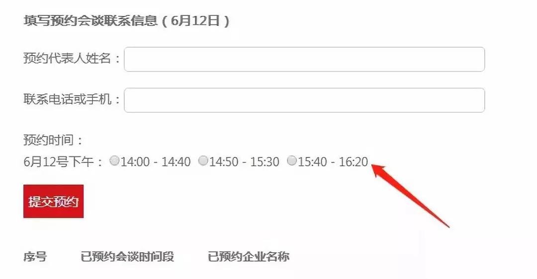 3.進(jìn)入外資企業(yè)信息界面,填寫預(yù)約會(huì)談聯(lián)系信息,選擇6月12日預(yù)約會(huì)談的時(shí)間段,然后提交預(yù)約即可。
