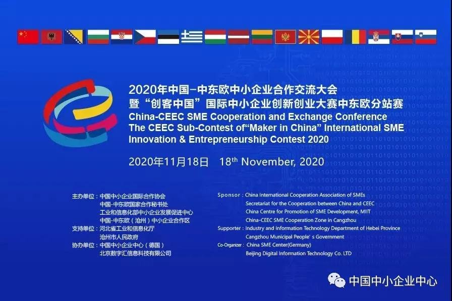 11月18日,由中國-中東歐國家合作秘書處、中國中小企業(yè)國際合作協(xié)會、工業(yè)和信息化部中小企業(yè)發(fā)展促進(jìn)中心及中國-中東歐(滄州)中小企業(yè)合作區(qū)共同主辦的“創(chuàng)客中國”國際中小企業(yè)創(chuàng)新創(chuàng)業(yè)大賽中東歐分站賽線上決賽暨中國-中東歐中小企業(yè)線上對洽會在北京隆重召開。中國中小企業(yè)中心(德國)是本次會議的協(xié)辦單位。
