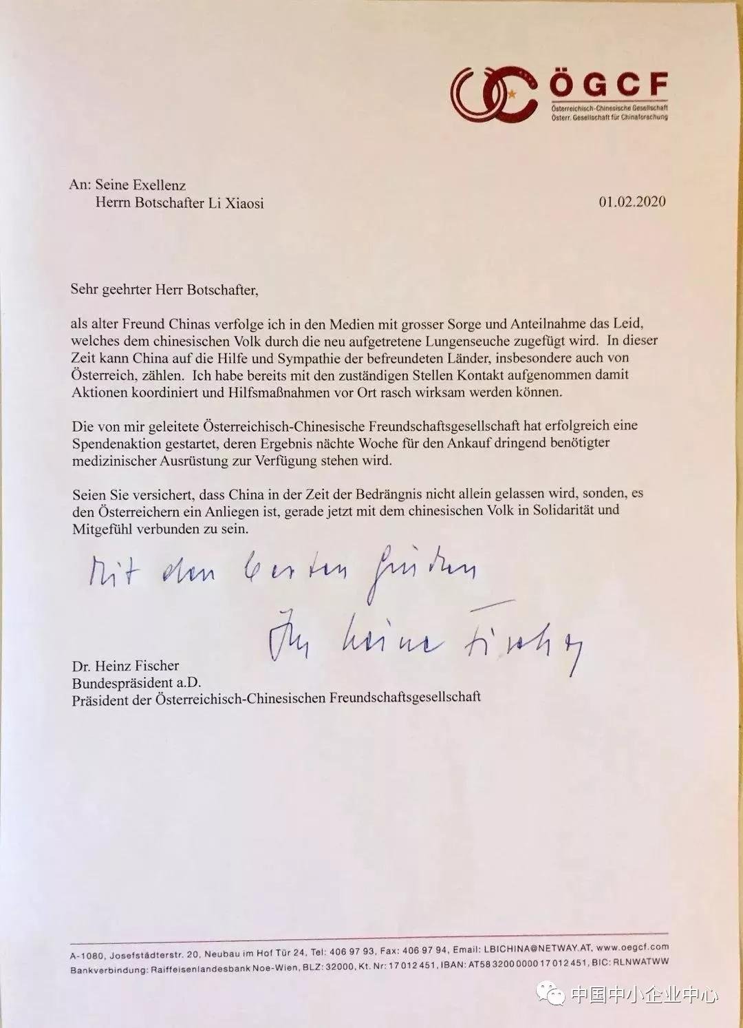 在致李曉駟大使的信中,菲舍爾前總統(tǒng)表示:作為中國(guó)的老朋友,我懷著擔(dān)憂和關(guān)切的心情在媒體上跟蹤新型冠狀病毒肺炎疫情帶給中國(guó)人民的不幸。在這一時(shí)刻,中國(guó)可以指望友好國(guó)家,特別是奧地利的同情和幫助。我已與主管部門(mén)進(jìn)行聯(lián)系,推動(dòng)協(xié)調(diào)各方行動(dòng),使援助措施能夠盡快發(fā)揮作用。我領(lǐng)導(dǎo)的奧中友協(xié)組織的捐助行動(dòng)已經(jīng)成功開(kāi)始,下周將用于采購(gòu)急需的醫(yī)療物資。請(qǐng)您放心,中國(guó)在危機(jī)時(shí)刻并不孤單。此時(shí)此刻奧地利人民與中國(guó)人民感同身受、團(tuán)結(jié)一致。