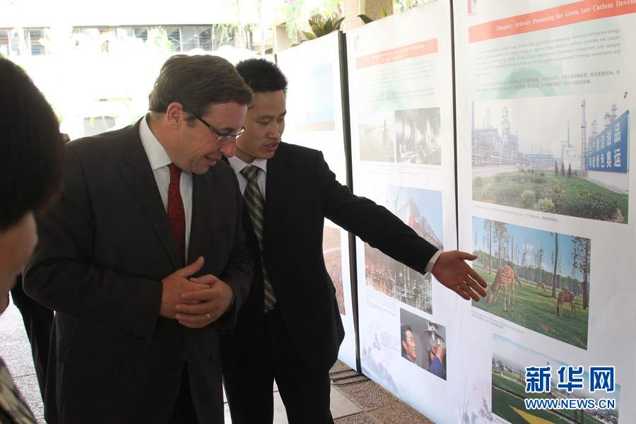 中國(guó)石化代表謝丹平(右)在為聯(lián)合國(guó)副秘書(shū)長(zhǎng)施泰納介紹企業(yè)環(huán)保責(zé)任圖片。汪勇基攝