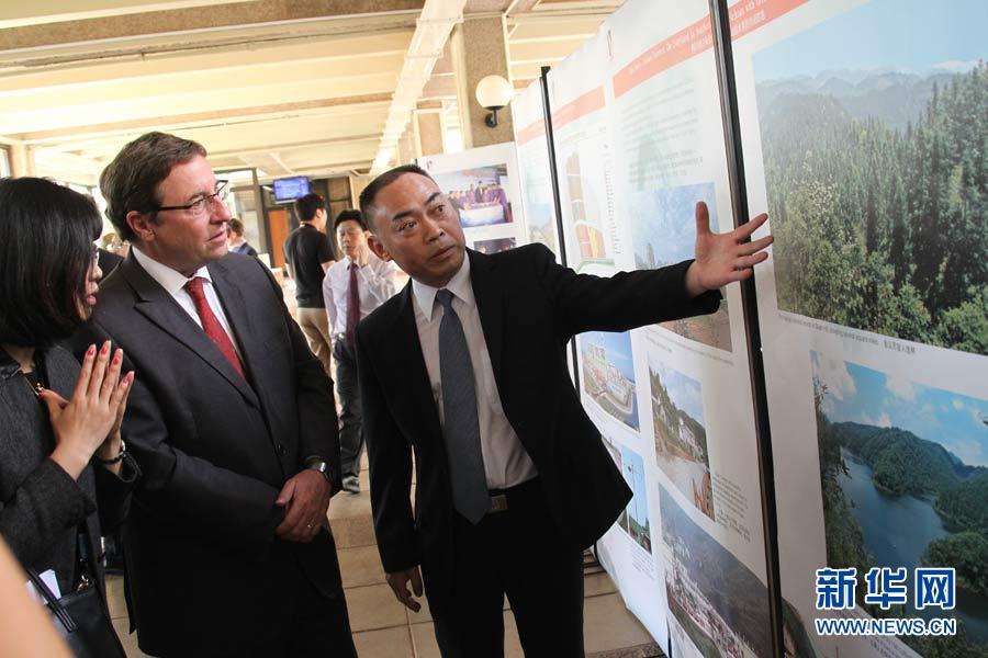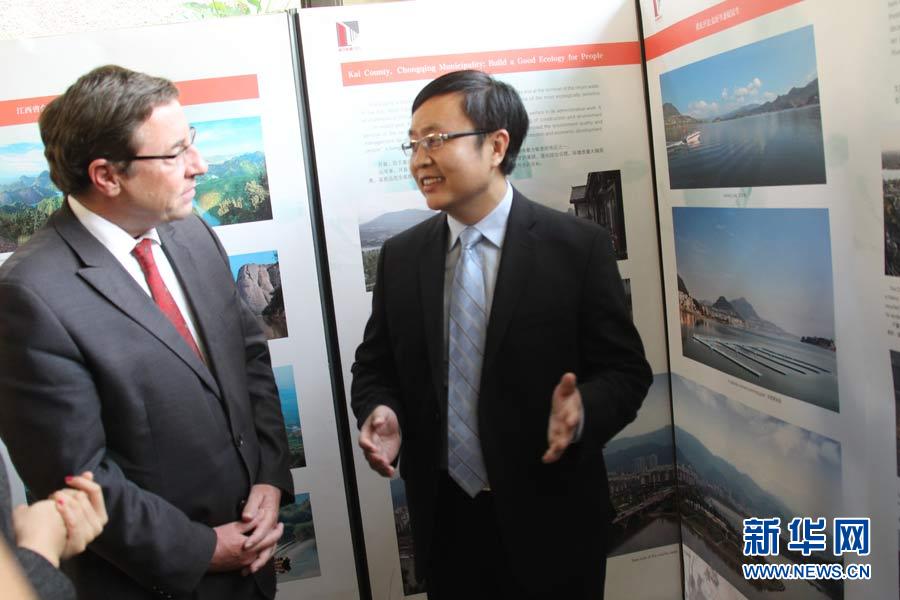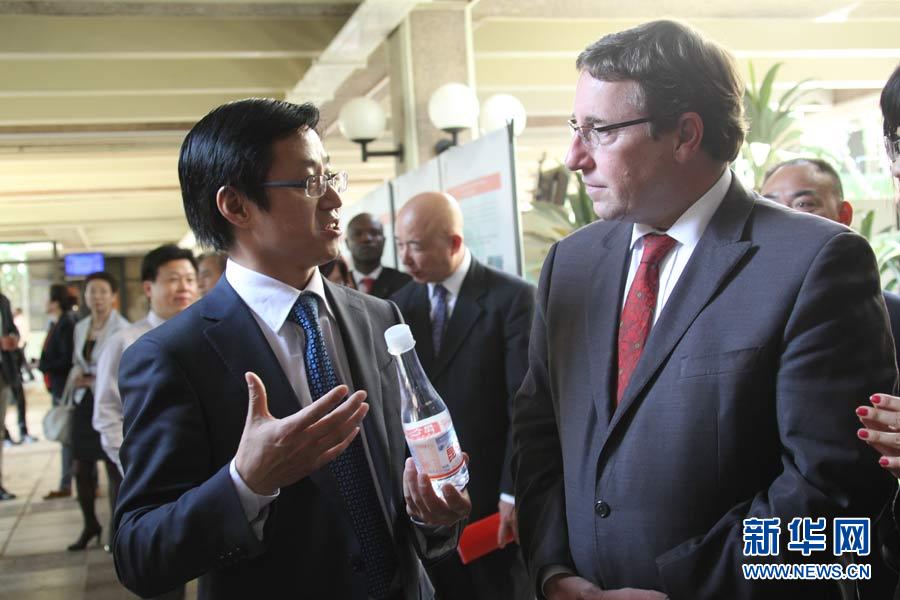 廣東省揭陽(yáng)市副市長(zhǎng)陳澄民(左)向聯(lián)合國(guó)副秘書(shū)長(zhǎng)施泰納介紹揭陽(yáng)市環(huán)保圖片。5月20日,“明月行動(dòng).綠色中國(guó)夢(mèng)”大型環(huán)保公益活動(dòng)中國(guó)環(huán)保圖片展在肯尼亞首都內(nèi)羅畢聯(lián)合國(guó)環(huán)境規(guī)劃署新華影廊舉行,展示中國(guó)地方政府和大型國(guó)資企業(yè)與知名企業(yè)關(guān)注環(huán)保、力行環(huán)保、堅(jiān)持環(huán)保的上百?gòu)垐D片,廣東省揭陽(yáng)市政府、中國(guó)石化集團(tuán)、西安浐灞生態(tài)區(qū)和加多寶集團(tuán)昆侖山礦泉水公司等代表在展覽中向聯(lián)合國(guó)官員及來(lái)賓介紹生態(tài)環(huán)保成就。汪勇基攝