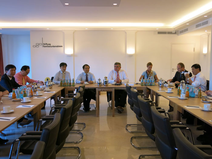 揭陽市經(jīng)貿(mào)代表團(tuán)與德國(guó)家族企業(yè)基金會(huì)執(zhí)行主席施耐德(右四)、德國(guó)金屬企業(yè)聯(lián)合會(huì)負(fù)責(zé)人哈德勒(右三)座談