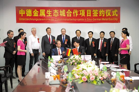 在創(chuàng)園之初,中德金屬生態(tài)城就已經(jīng)和多家來自德國的企業(yè)達成了入園投資意向。國家主席習近平訪問德國期間與德國總理默克爾共同發(fā)表《建立中德全方位戰(zhàn)略伙伴關系的聯(lián)合聲明》,并見證了中德雙邊合作文件的簽署,涉及汽車、信息化、金融、節(jié)能環(huán)保等多個領域。其中,來自中德金屬生態(tài)城的“中德資源再生基地”項目為十個簽約的經(jīng)濟項目中來自廣東的唯一項目。10月,國家總理李克強出訪德國柏林,與德國總理默克爾等中德政府高級官員和兩國經(jīng)濟界人士共同出席第七屆中德經(jīng)濟技術合作論壇。作為與德合作的示范企業(yè),中德金屬集團與阿德勒斯霍夫科技園區(qū)管理機構維斯塔公司簽署共建中德金屬生態(tài)城合作協(xié)議,與達姆施塔特工業(yè)大學IWAR研究所簽署中德金屬生態(tài)城分質(zhì)水處理及資源化利用項目合作協(xié)議,成為此次論壇中唯一一個成功簽約兩個項目的單位。