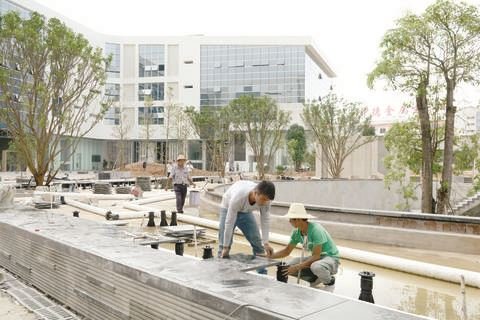 鋪貼石板、種植綠化、修筑景觀水池……國慶期間,中德金屬生態(tài)城四大中心工程中庭園林施工現(xiàn)場(chǎng)一派繁忙,工人有條不紊地推進(jìn)各項(xiàng)施工。